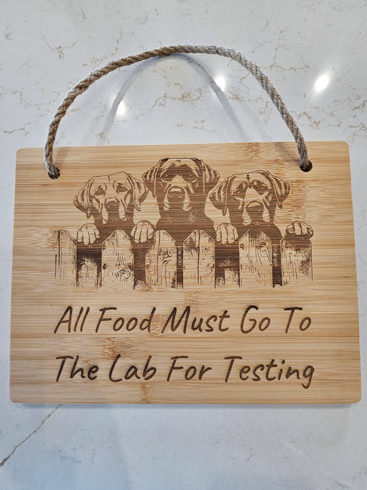 Engraved Bamboo Board – “All Food Must Go To The Lab For Testing” | Labrador Kitchen Décor