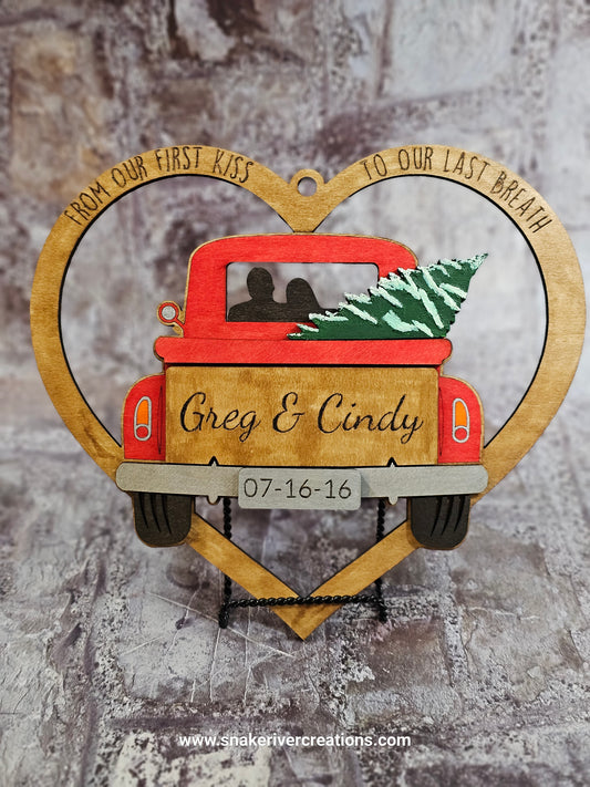 Old Truck with Christmas Tree Ornament or Sign - From our First Kiss to Our Last Breath