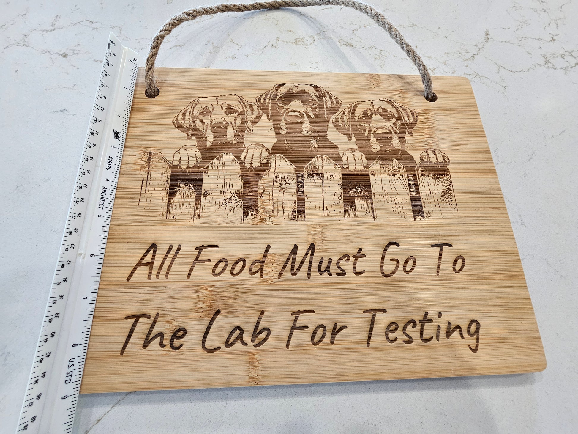 Engraved Bamboo Board – “All Food Must Go To The Lab For Testing” | Labrador Kitchen Décor